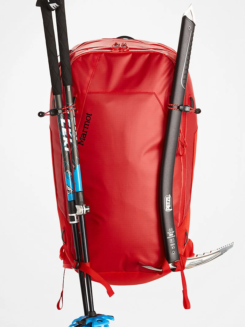 This pack was developed as a backcountry ski/snowboarding pack with custom branded ski straps. This pack took about 6 months to develop, with 4 rounds of samples, and 2 rounds of athlete testing. This pack has the ability to cross carry skis, side carry skis, and back carry snowboard.